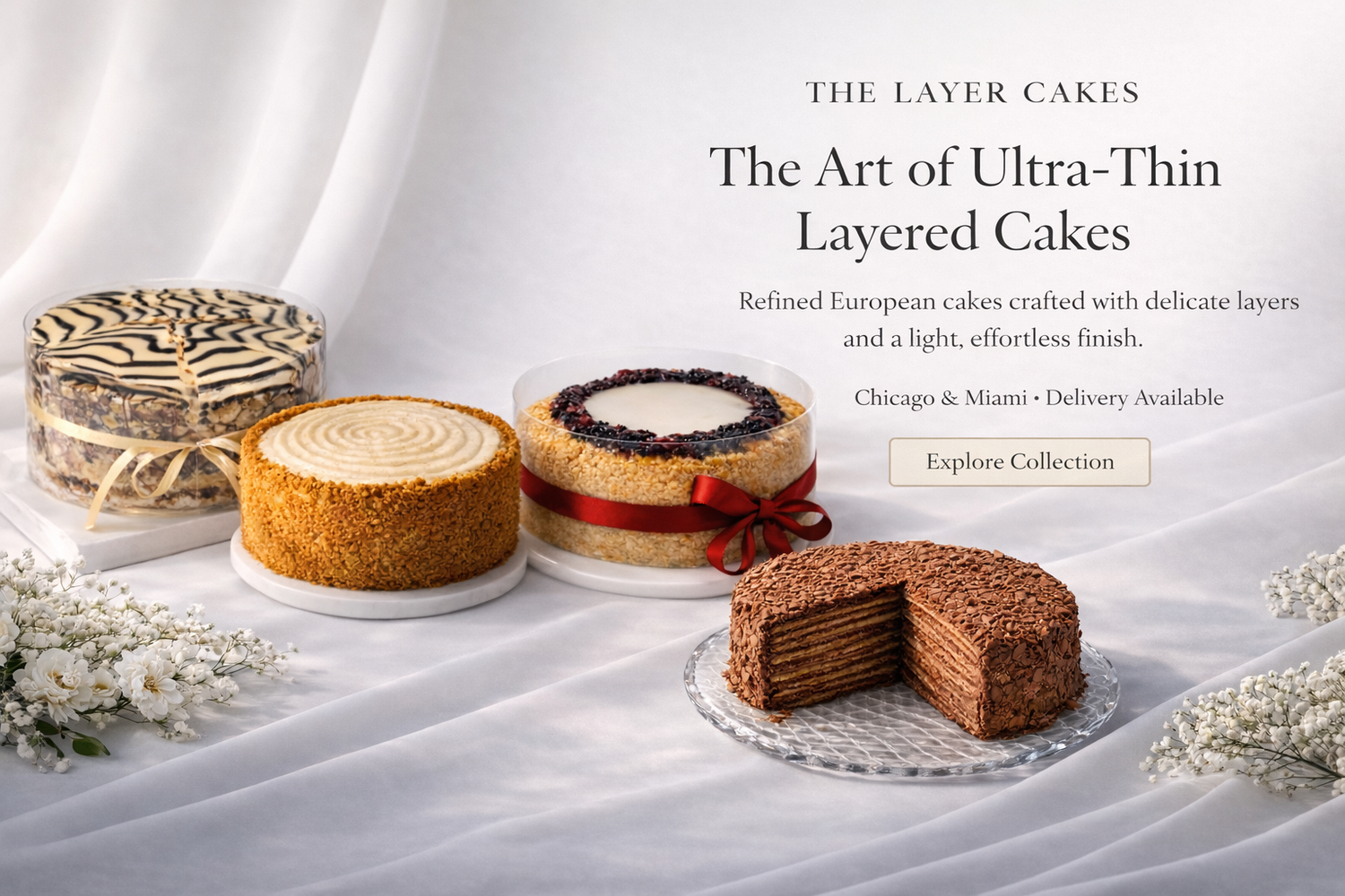 A curated selection of refined layer cakes — delicate, balanced, and designed to impress without heaviness.